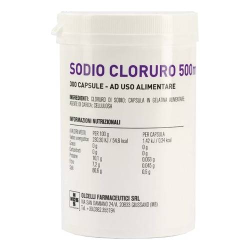 Sodio Cloruro 0,5 g (500 mg)Descrizione Integratore alimentare a base di sodio cloruro. Ingredienti Cloruro di sodio; capsula in gelatina alimentare; agente di carica; cellulosa; colorante; biossido di titanio. Caratteristiche nutrizionali Valori medi per 100 g per capsula Valore energetico 230,30 KJ / 54,8 kcal 1,42 kJ / 0,34 kcal Grassi 0 g 0 g Carboidrati 0 g 0 g Proteine 10,1 g 0,063 g Fibre 7,2 g 0,045 g Sale 80,6 g 0,5 g Conservazione Proteggere da luce e calore. Validità a confezionamento integro: 36 mesi. Formato Barattolo da 300 capsule da 0.62g (620mg) ad uso alimentare. Ogni capsula contiene 0.5g (500...